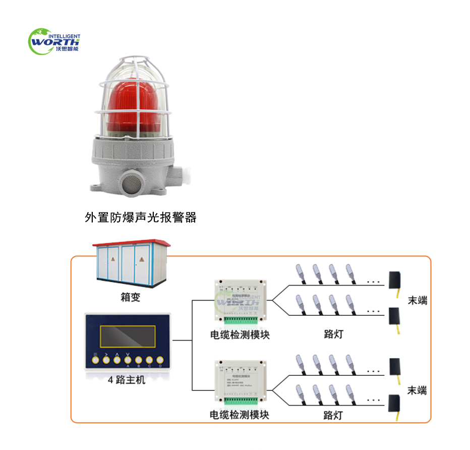 無(wú)錫沃思智能科技有限公司開(kāi)發(fā)的路燈電纜智能報(bào)警系統(tǒng)由電纜防盜監(jiān)控主機(jī)、電纜檢測(cè)模塊、末端觸發(fā)器三部分組成,無(wú)論白天還是晚上,無(wú)論路燈電纜有電還是沒(méi)電,都能在路燈電纜被剪斷時(shí),或者是配電箱被非法打開(kāi)時(shí),檢測(cè)模塊檢測(cè)到末端發(fā)來(lái)的信號(hào)后,再將電纜狀態(tài)信號(hào)傳輸給GSM報(bào)警主機(jī),電纜防盜監(jiān)控主機(jī)通過(guò)內(nèi)置SIM卡,發(fā)送報(bào)警信號(hào)給預(yù)設(shè)的5個(gè)報(bào)警號(hào)碼,以此形成一個(gè)防盜報(bào)警系統(tǒng),(現(xiàn)場(chǎng)配電箱外接聲光報(bào)警器,管理人員可以迅速鎖定被盜位置)。電纜防盜報(bào)警系統(tǒng)正常工作時(shí),通過(guò)發(fā)送短信,對(duì)其進(jìn)行參數(shù)設(shè)置。4G無(wú)線(xiàn)方案