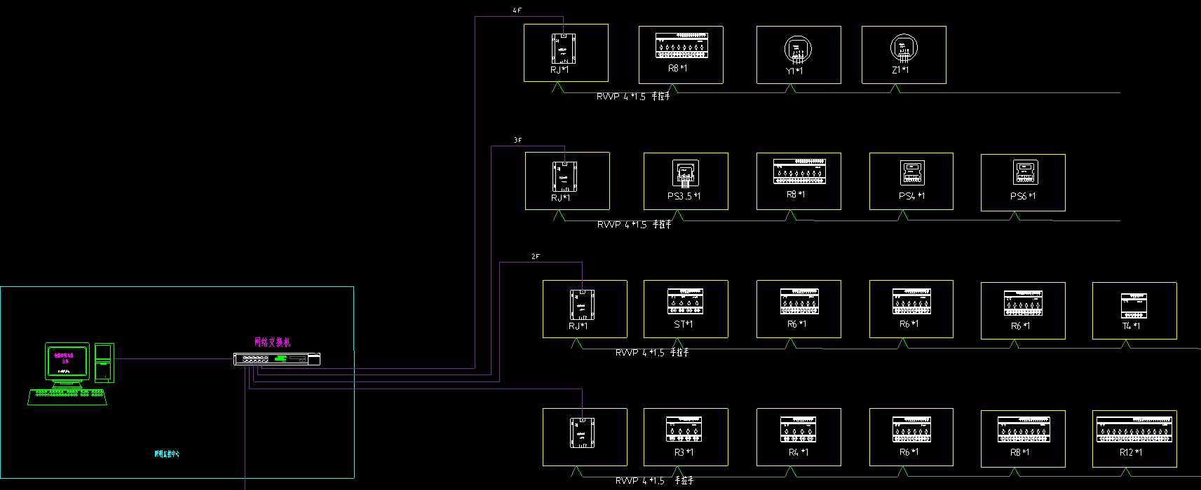4、物理連接:總線工作電壓 DC 24V,采用 RVVP4 x 1.0 雙絞線將設備連成一個網絡??偩€單獨使用鍍鋅鋼管敷設,并與電力電纜的水平距離至少大于 300mm;一條獨立線路(不含 24V 直流供電線),通信速率在高、中、低時,總線最長距離分別為 500 米、1000 米、2500 米。也可以增加 HUB 模塊及耦合器來延長總線距離。