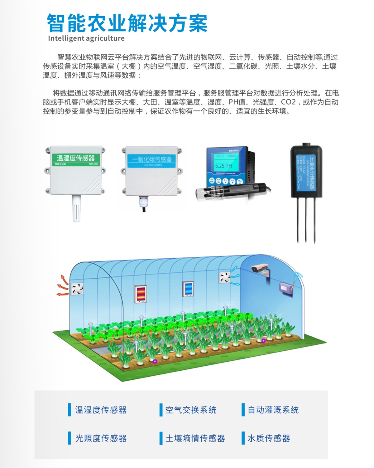智慧農(nóng)業(yè)物聯(lián)網(wǎng)云平臺解決方案結(jié)合了物聯(lián)網(wǎng)、云計算、傳感器、自動控制等通過傳感設(shè)備實時采集溫室(大棚)內(nèi)的空氣溫度、空氣濕度、二氧化碳、光照、土壤水分、土壤溫度、棚外溫度與風(fēng)速等數(shù)據(jù);