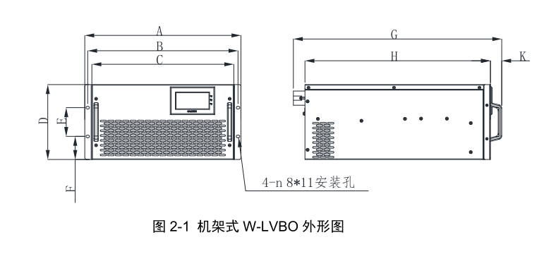 W-LVBO 系列產(chǎn)品根據(jù)安裝方式可分為機(jī)架式和壁掛式,二者外形尺寸標(biāo)注示意如圖 2-1、2-2。產(chǎn)品覆蓋 50A~150A,按照功率等級的大小有三種不同尺寸機(jī)箱,具體外形安裝尺寸見表 2-2。