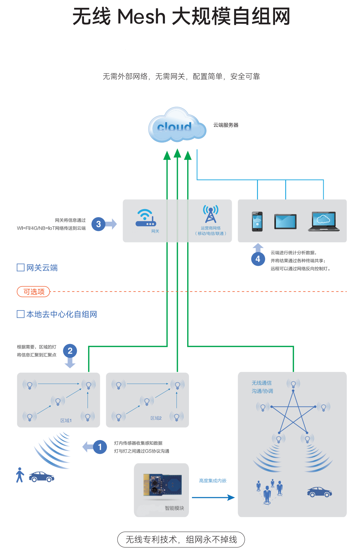 自組網(wǎng)通信基于Mesh協(xié)議,節(jié)點(diǎn)自動(dòng)組網(wǎng),多跳中繼,斷點(diǎn)自愈,覆蓋半徑達(dá)500米無(wú)需布線,抗干擾強(qiáng),適合復(fù)雜環(huán)境