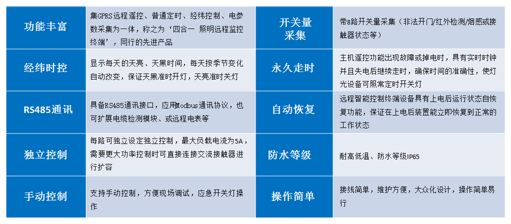 實現(xiàn)分組、分片、分時以及間隔、單側(cè)、主/輔道等場景策略控制;方便切換經(jīng)緯模式控制、工作日、雙休日、節(jié)假日、重大活動等運行模式;遠程集控和終端本地自控相結(jié)合的雙保險措施,確??茖W(xué)、合理開/關(guān)燈;兼容GPRS(2G/4G)/CDMA/NB-IOT等多種通訊方式和通信協(xié)議,方便實現(xiàn)系統(tǒng)的升級改造;通信協(xié)議采用TCP協(xié)議,即可與中心站對接,也可與云平臺對接;預(yù)留多通訊接口:RS485,RJ-45網(wǎng)口等